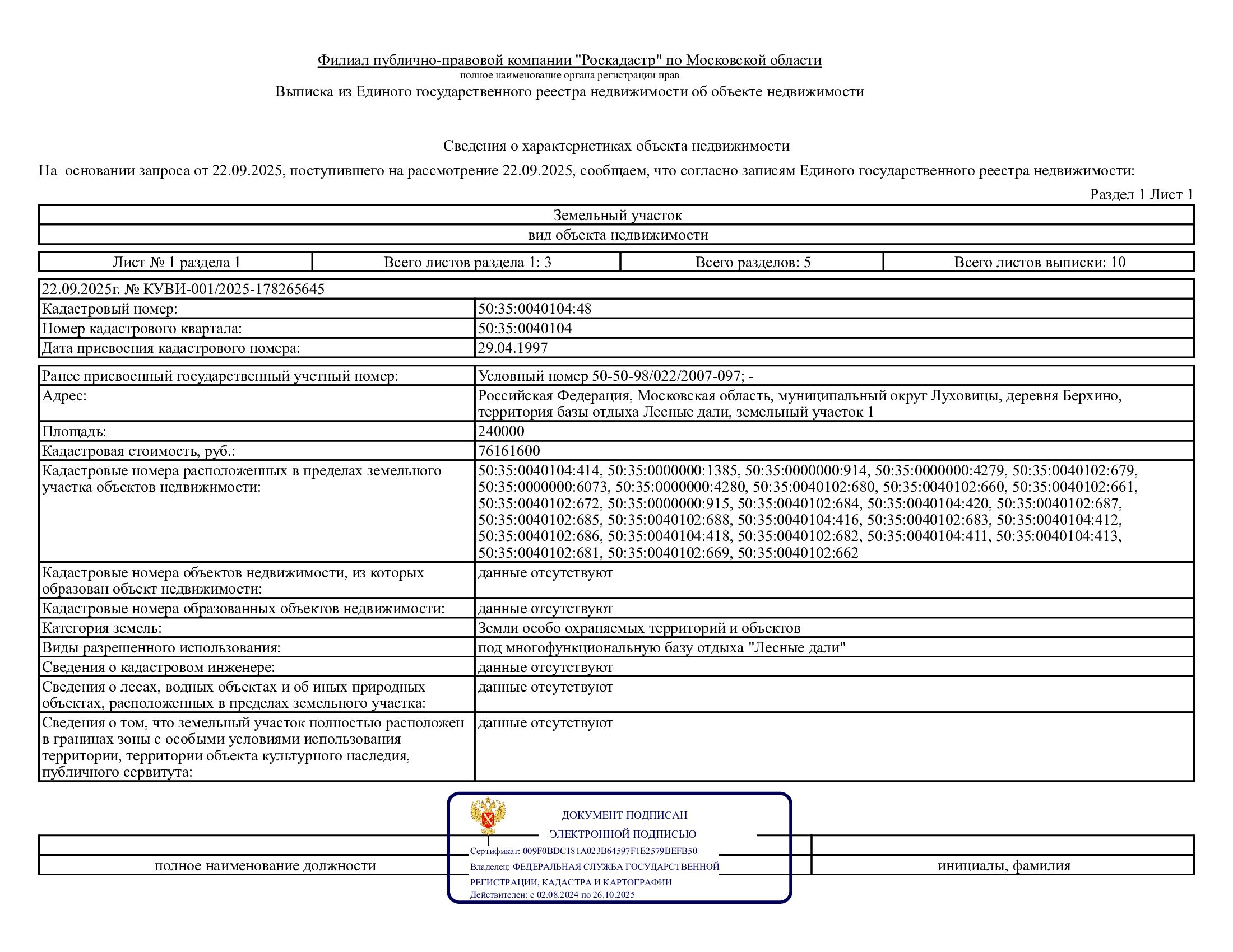 Адрес: Российская Федерация, Московская область, муниципальный округ Луховицы, деревня Берхино, территория базы отдыха Лесные дали, земельный участок 1.