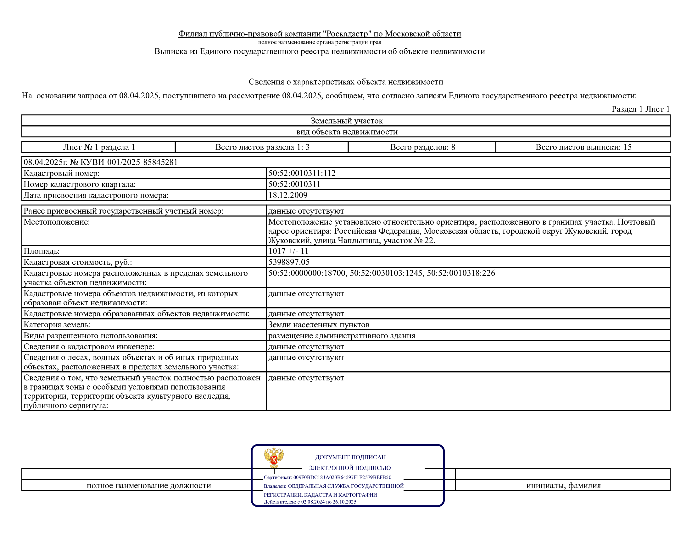 Местоположение: Местоположение установлено относительно ориентира, расположенного в границах участка. Почтовый адрес ориентира: Российская Федерация, Московская область, городской округ Жуковский, город Жуковский, улица Чаплыгина, участок № 22.