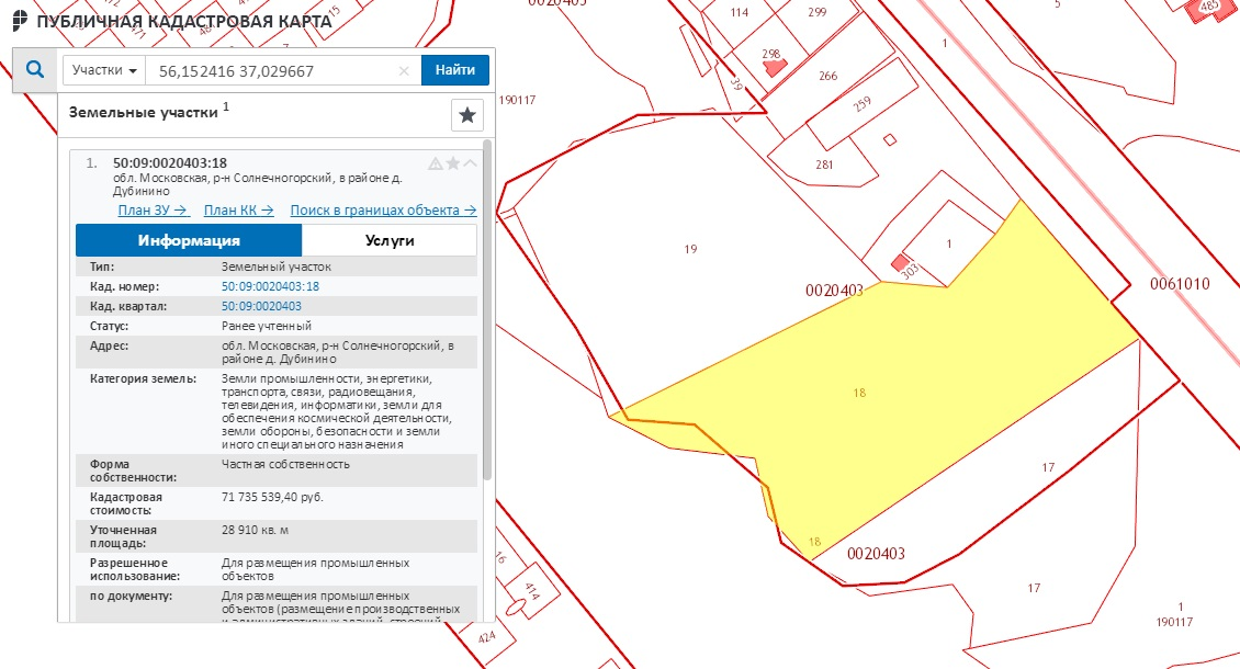Земельный участок, площадью 28910 кв.м., категория земель: земли промышленности, энергетики, транспорта, связи, радиовещания, телевидения, информатики, земли для обеспечения космической деятельности, земли обороны, безопасности и земли иного специального назначения, виды разрешенного использования: для размещения промышленных объектов (размещение производственных и административных зданий, строений, сооружений и обслуживающих их объектов), расположенный по адресу: местоположение установлено относительно ориентира, расположенного в границах участка. Почтовый адрес ориентира: обл. Московская, р-н Солнечногорский, в районе д. Дубинино, кадастровый номер: 50:09:0020403:18 (имущество ДЗО)